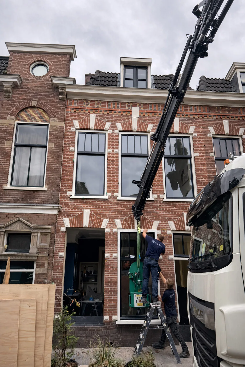 Voor dit project in Leiden hebben wij een monumentaal pand voorzien van nieuwe houten kozijnen. De oorspronkelijke schuiframen zijn aan de buitenzijde in dezelfde stijl behouden, maar uitgevoerd als draaikiepramen voor meer comfort en gebruiksgemak. De plaatsing is uitgevoerd met behulp van een hijskraan.